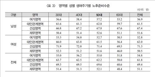 분석 결과 50대의 노후준비 지수는 대인관계 영역과 건강 영역에서 각각 62.2점과 69.6점을 기록해 양호한 편이었지만, 재무 영역의 노후준비 지수는 52.1점으로 상대적으로 낮았다.