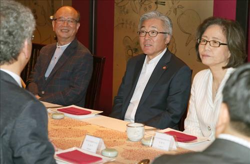 | △ 김종덕 문화체육관광부 장관(가운데)이 8일 오후 광화문 한 식당에서 연극계 원로 6명과 오찬을 겸해 이야기를 나누고 있다. |