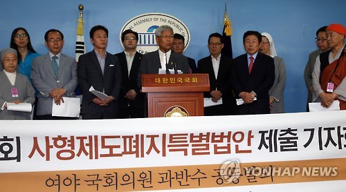 | △ 사형제도 폐지 기자회견하는 의원들과 종교인들 (서울=연합뉴스) 도광환 기자 = 새정치민주연합 유인태의원을 대표로 여야의원들과 종교인들이 6일 오전 국회 정론관에서 사형제도 폐지 특별법안에 대한 기자회견을 하고 있다. 2015.7.6 dohh@yna.co.kr |