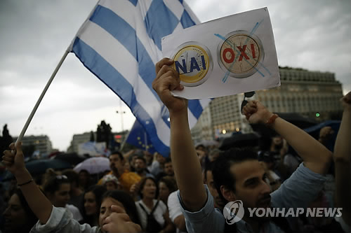 | △ 유로 '예'(NAI); 드라크마 '아니오'(OXI) (아테네 AP=연합뉴스) 그리스가 국제통화기금(IMF)의 채무 상환 만기일인 지난달 30일(현지시간)을 넘기면서 부도상태에 빠졌다. 국제통화기금(IMF) 대변인은 "IMF 이사회에 그리스의 '체납'(arrears) 사실을 알렸다"며 "체납이 해결돼야 그리스는 IMF 구제금융을 받을 수 있을 것"이라고 말했다. 그리스 정부는 지난달 5일 만기가 돌아왔던 3억 유로(약 3천781억원)를 포함 부채 15억5천만 유로(약 1조9천억 원)를 지난달 말에 일괄적으로 갚을 계획이라고 밝힌 바 있다. 사진은 오는 5일 국민투표에서 채권단의 수정안을 받아들일 것을 촉구하는 아테네의 이날 집회 도중 한 참가자가 유로화와 드라크마화(유로화 사용 이전 그리스 옛 화폐) 그림에 각각 O, X를 표시한 종이를 들고 있는 모습. bulls@yna.co.kr A demonstrator holds a placard depicting Yes to euro, No to drachma during a rally organized by supporters of the YES vote to the upcoming referendum in Athens, Tuesday, June 30, 2015. Greece's European creditors were assessing a last-minute proposal Athens made for a new two-year rescue deal, submitted just hours before the country's international bailout program expires and it loses access to billions of euros in funds. (AP Photo/Daniel Ochoa de Olza) |