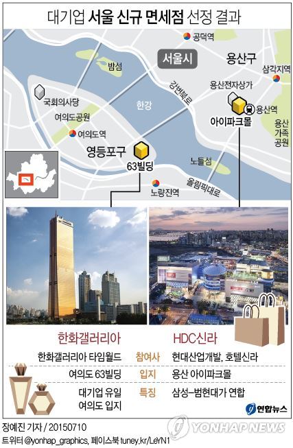 (영종도=연합뉴스) 이광빈 신호경 기자 = '황금티켓'으로 불린 서울지역 신규 면세점 특허권 2장을 놓고 벌인 대기업들의 치열한 유치전에서 현대산업개발과 호텔신라[008770]의 합작법인인 HDC신라면세점과 한화그룹 계열인 한화갤러리아타임월드가 승리했다.