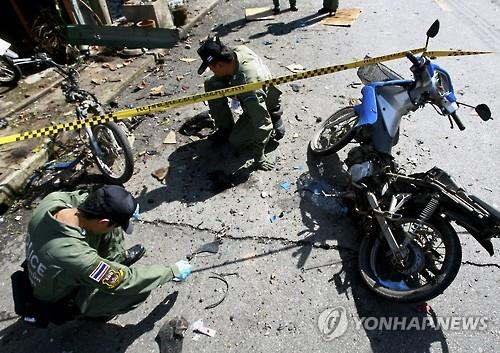 | △ 태국 폭발물처리반이 11일 남부 송클라주에서 발생한 테러 현장을 조사하고 있다.(EPA=연합뉴스) |