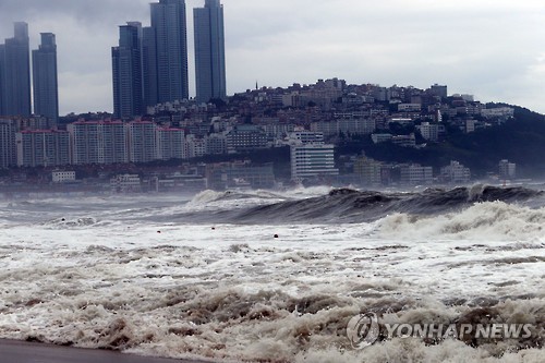 | △ 태풍 찬홈 파도 몰아치는 해운대 (부산=연합뉴스) 조정호 기자 = 12일 북상하는 제9호 태풍 '찬홈(CHAN-HOM)'의 영향으로 부산 해운대해수욕장에 거대한 파도가 몰아치면서 수영금지 조치가 내려졌다. 2015.7.12 ccho@yna.co.kr |