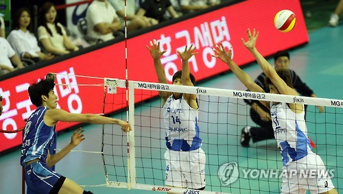 | △ 류윤식 강스파이크 (청주=연합뉴스) 이승민 기자 = 12일 오후 청주실내체육관에서 열린 2015 청주·KOVO컵 프로배구대회 우리카드와 삼성화재의 경기에서 삼성화재 류윤식이 강스파이크하고있다. 2015.7.12 vodcast@yna.co.kr |