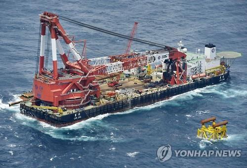| △ 2013 7월 5일 동중국해 해상에서 촬영한 중국의 가스전 관련 시설(오른쪽 아래 노란색 구조물)과 해상 크레인선의 모습. (교도=연합뉴스 자료사진) |