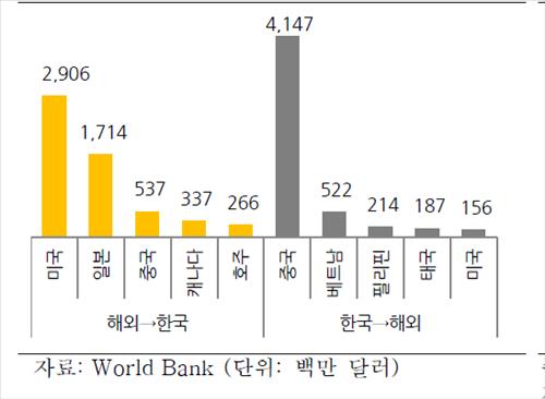 13일 KB금융경영연구소 강서진 연구원이 세계은행 자료를 토대로 작성한 '해외송금 핀테크 기업의 성장과 시사점' 보고서에 따르면 지난해 해외에서의 국내 송금액은 64억8천만 달러로 국내에서 해외로의 송금액(58억 달러)보다 6억8천만 달러(약 7천700억원) 많았다.