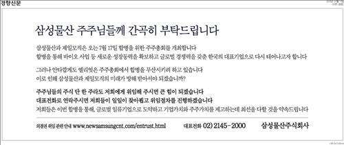 '삼성물산 주주님들께 간곡히 부탁드립니다'라는 제목의 이 광고는 '엘리엇이 합병 주총을 무산시키려 합니다. 삼성물산과 제일모직의 미래가 방해받아서야 되겠습니까. 주식 단 한 주라도 위임해 주시면 큰 힘이 되겠습니다'라고 호소했다.