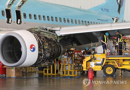 | △ 서울 강서구 공항동 대한항공 본사 격납고에서 정비사들이 B737기 기체와 엔진 등 각종 장비와 부품을 검사하고 있다. (연합뉴스 자료사진) |