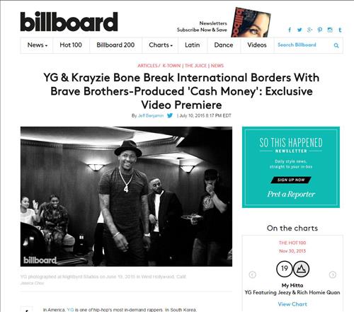 빌보드는 11일(현지시간) 'YG & 크레이지본, 용감한형제가 프로듀싱한 신곡 '캐시 머니'(Cash Money)로 국경을 깨다'란 제목의 기사에서 용감한형제를 "K팝 최고의 프로듀서 중 한 명"이라고 치켜세웠다.