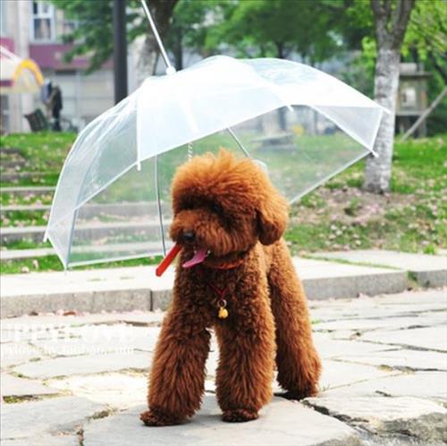 강아지우산은 우산에 연결된 체인을 목줄에 걸어 사용하는 제품으로 비오는 날에도 야외활동을 즐길 수 있도록 도와준다.