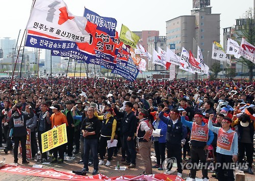 | △ 민노총 울산본부 총파업 집회 (울산=연합뉴스) 김용태 기자 = 24일 오후 울산시 남구 태화강역 광장에서 열린 민주노총 파업 집회에 참가한 노조원들이 구호를 외치고 있다. 2015.4.24 yongtae@yna.co.kr |