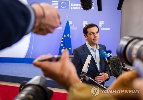 | △ 그리스 제3차 구제금융 협상을 위한 유로존 정상회의가 끝난 뒤 알렉시스 치프라스 그리스 총리가 기자회견을 하고 있다.(연합뉴스 사진DB) |