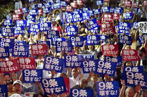 | △ 14일 도쿄 히비야 야외음악당에서 열린 집단 자위권 법안 반대 집회. 시민 약 2만명이 참가했다. (교도.연합뉴스) |