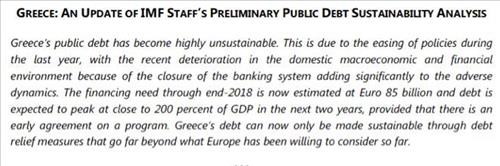 따라서 그리스 부채는 EU 채권단이 지금까지 고려한 부채경감 조치보다 훨씬 강한 조치를 해야만 지속가능하게 됐다고 지적했다.