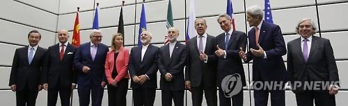 | △ 이란과 주요 6개국 협상 책임자들이 14일(현지시간) 오스트리아의 빈에서 이란 핵협상을 타결지은 뒤 한 자리에 모여 결과를 설명하고 있다. (AP=연합뉴스) |
