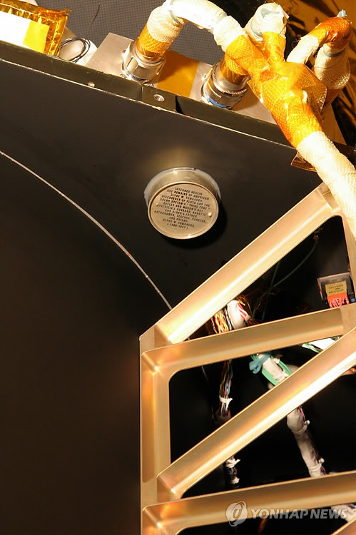 | △ 명왕성 발견자 유골 실은 탐사선 '뉴호라이즌스' 1930년 명왕성 발견의 공로를 기리려고 미국인 천문학자 클라이드 톰보의 유해가 담긴 알루미늄 통을 명왕성 탐사선 '뉴호라이즌스'에 부착해 놓았다. 이 탐사선은 14일(미국 시각) 명왕성 최근접점인 7천800마일(약 1만2천553km) 이내로 접근하게 된다.(AP자료사진) ciy@yna.co.kr |