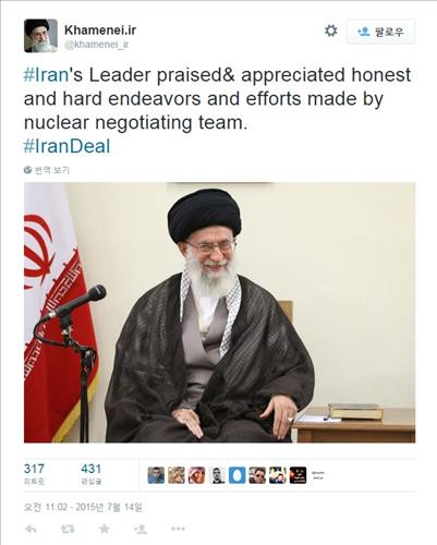 <이란 핵타결> 이란 최고지도자 "이란 핵협상팀에 감사" 트윗