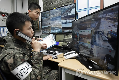 | △ GOP 과학화 경계시스템 도입 (철원=연합뉴스) 이해용 기자 = GOP 과학화 경계시스템이 도입된 강원 철원군 육군 6사단 최전방부대에서 상황병이 CCTV 모니터를 보며 철책선 주변을 감시하고 있다. |