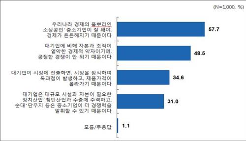 이렇게 응답한 사람의 57.5%는 '우리나라 경제의 풀뿌리인 소상공인 및 중소기업이 잘 돼야 경제가 튼튼해지기 때문'이란 이유를 든 것으로 조사됐다.