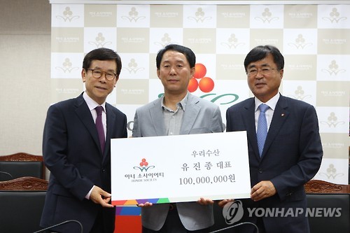 | △ 사천시 1호 '고액 기부자' 탄생 (사천=연합뉴스) 경남 사천시 우리수산 유진종 대표(가운데)가 15일 사천시청에서 1억원 기부 약정서에 서명한 뒤 기념촬영을 하고 있다. 그는 경남에서 56번째, 사천시에서 처음 고액 기부자 모임인 '아너 소사이어티' 회원이 됐다. 왼쪽은 송도근 사천시장, 오른쪽은 한철수 경남사회복지공동모금회장. 2015.7.15 <<경남사회복지공동모금회>> kyunglee@yna.co.kr |
