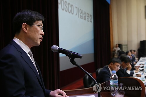 | △ 권오준, 포스코 경영쇄신안 발표 (서울=연합뉴스) 진성철 기자 = 권오준 포스코 회장이 15일 서울 여의도 한국거래소에서 개최한 기업설명회에서 경영쇄신안을 발표하고 있다. |