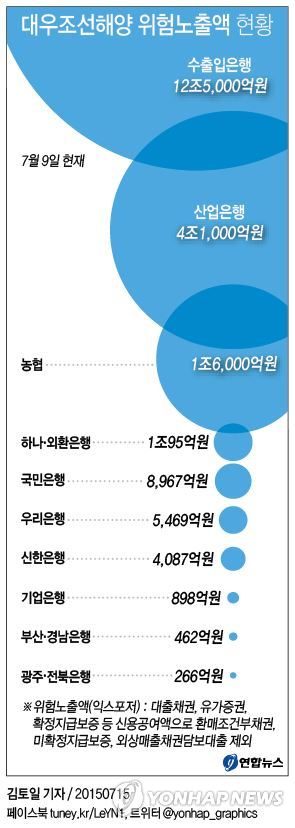 위험노출액(익스포저)을 은행별로 보면 수출입은행이 12조5천억원에 달하고 산업은행과 농협이 각각 4조1천억원, 1조6천억원이다.