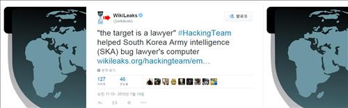 위키리크스는 14일(현지시간) 트위터를 통해 해킹팀이 2013년 9월 16∼17일'SKA'(South Korea Army Intelligence)를 도와 한 변호사의 컴퓨터에 해킹 프로그램을 설치했다는 것을 드러내는 이메일을 공개했다.