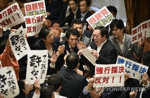 이날 '강행 표결 반대' 등이 적힌 종이를 든 야당 의원들이 위원장 단상을 둘러싼 채 '표결은 있을 수 없다'고 외치는 와중에 자민당과 공명당 소속 의원들이 기립함으로써 법안은 가결됐다.