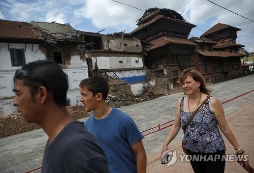 | △ 지난달 15일 네팔 카트만두 바산타푸르 더르바르 광장에서 관광객이 지진으로 무너진 건물 옆을 걷고 있다.(AP=연합뉴스) |