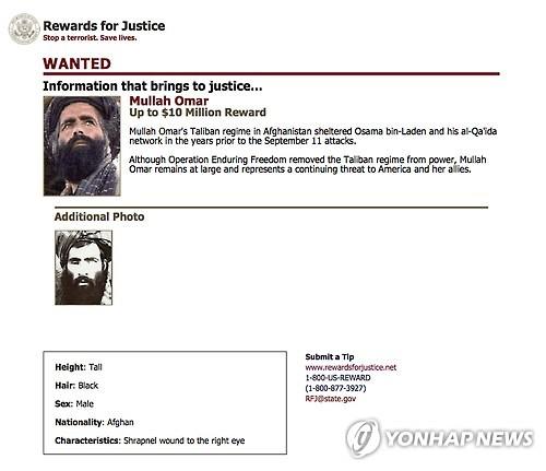 | △ 아프간 탈레반 최고 지도자 물라 무함마드 오마르. 사진은 미 연방수사국이 배포한 그의 현상수배 포스터. 그에게는 1천만 달러의 현상금이 걸려있다.(AP=연합뉴스) |