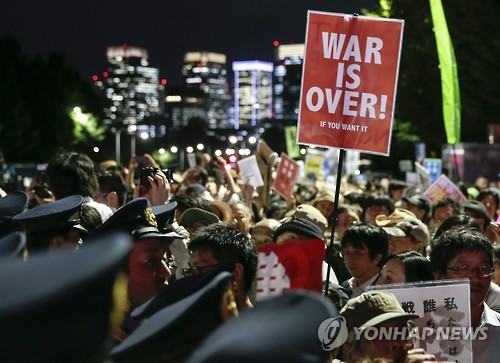 (도쿄=연합뉴스) 조준형 이세원 특파원 = 일본 아베 신조(安倍晋三) 정권이 16일 집단 자위권 법안을 중의원(하원)에서 강행 처리했다.