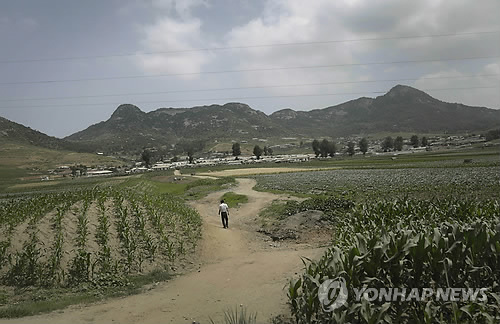 | △ 북한이 100년만의 극심한 가뭄에 시달리고 있는 가운데 지난달 23일(현지시간) 평안남도 남포시 주민이 옥수수밭 사이로 걸어가고 있다. (AP=연합뉴스) |