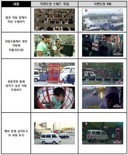 제작진은 "특히 '극한도전'의 4회 방송분은 지난 2011년 9월에 방송된 '무한도전'의 '스피드 특집2'와 비교하면, 기획의도와 구성 내용, 카메라 앵글과 자막까지 거의 복사 수준으로 베꼈다는 분석이 나오고 있다"며 두 프로그램을 조목조목 비교했다.