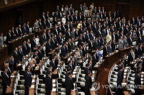 | △ 일본 집권 자민당과 연립 여당인 공명당 의원들이 16일 오후 중의원 본회의에서 대다수 야당의원들이 퇴장한 가운데, 자위대법 개정안을 비롯한 11개 안보 관련법 제·개정안(일명 집단 자위권 법안) 표결에서 찬성 표시로 기립한 모습.(EPA=연합뉴스) |