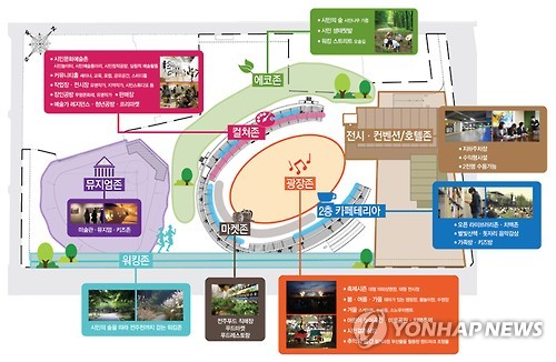 | △ 시민공원으로 조성될 전주종합경기장 배치도 (전주=연합뉴스) 전북 전주시는 종합경기장을 컨벤션센터와 호텔, 문화·생활시설 등을 갖춘 시민공원으로 조성하기로 했다고 14일 밝혔다. 사진은 배치도. 2015.7.14 <<전주시>> ichong@yna.co.kr |