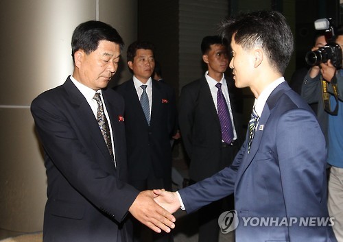 | △ 남북공동위 6차 회의 성과 없이 끝나 (개성 사진공동취재단=연합뉴스) 이상민(오른쪽) 통일부 남북협력지구발전기획단장이 17일 새벽 제6차 개성공단 남북공동위원회 회담을 마친 뒤 개성공단 종합지원센터를 떠나며 박철수(북측) 중앙특구개발지도총국 부총국장이 악수하고 있다. 2015.7.17 photo@yna.co.kr |