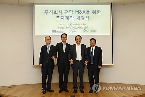 옵티스 컨소시엄(옵티스-쏠리드)과 팬택은 17일 오후 쏠리드[050890] 판교 사옥에서 인수합병(M&A) 본계약을 체결했다.