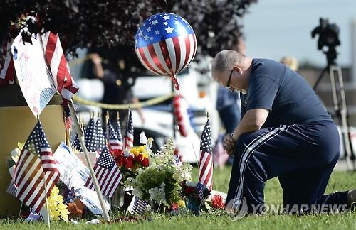 | △ 한 시민이 17일(현지시간) 미국 테네시 주 채터누가에서 총기 난사로 희생된 미 해병 4명을 기리며 추모하고 있다. 전날 발생한 총기 난사로 용의자를 포함해 5명이 사망하고 3명이 다쳤다. (AP=연합뉴스) |