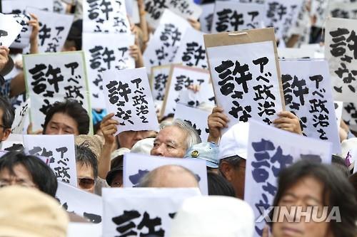(도쿄=연합뉴스) 조준형 특파원 = 집단 자위권 법안에 대한 일본 시민사회의 저항이 계속되고 있는 가운데, '아베 정치를 용서하지 않겠다'는 글귀가 적힌 종이가 시위의 상징물로 부상했다.