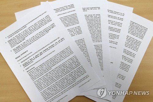 (서울=연합뉴스) 이귀원 기자 = 일본 근대산업시설을 세계유산으로 등재한 결정문이 유네스코 세계유산위원회(WHC) 홈페이지(http://whc.unesco.org/en/sessions/39com/)에 공식 게재된 것으로 19일 확인됐다.