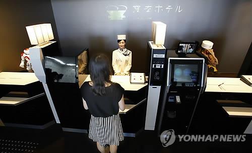 | △ (사세보<일본> AP=연합뉴스) 일본 나가사키현 사세보의 '이상한 호텔'(헨나 호텔) 프론트에서 로봇 접수계원(앞쪽 가운데)이 손님의 투숙 과정을 시연하는 종업원을 맞으며 인사하고 있다. |
