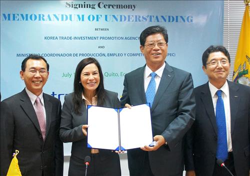 (서울=연합뉴스) 이봉준 기자 = 코트라는 19일(현지시간) 에콰도르 수도 키토에서 에콰도르 생산고용경쟁력조정부(MCPEC)와 무역 진흥 및 투자유치 노하우 공유를 위한 협력 협정(MOU)을 맺었다고 20일 밝혔다.