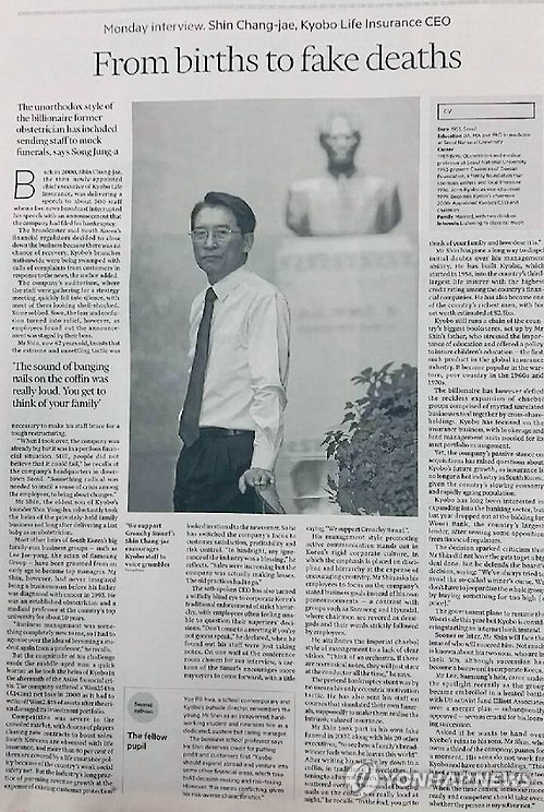 이 밖에 FT는 2000년 신 회장이 취임 직후 연설을 하던 도중 '교보생명이 파산했다'는 가상 뉴스를 틀어 강당을 잠시 충격에 빠뜨리고 임직원들에게 경각심을 일깨워준 일화를 소개했다.