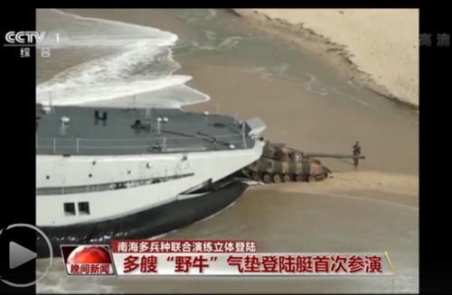 | △ 중국해군의 남중국해 상륙훈련 장면. 대형 공기부양선에 실린 탱크들이 상륙작전을 시도하고 있다. <<CCTV 화면 캡처>> |