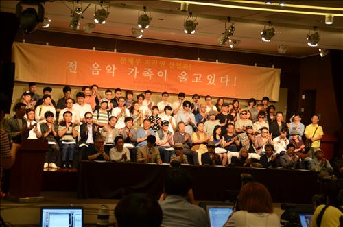 이에 한음저협은 20일 오후 서울 63빌딩에서 문체부의 개정안 승인을 규탄하는 기자회견을 열었다. 이 자리에는 신중현·윤형주 등 원로 음악인들은 물론 김희갑·윤일상·김형석 등 유명 작곡가들이 참여했다. 또 김현철, 주영훈, 윤종신, 김창렬 등 젊은 음악인들도 다수 자리를 지켰다.