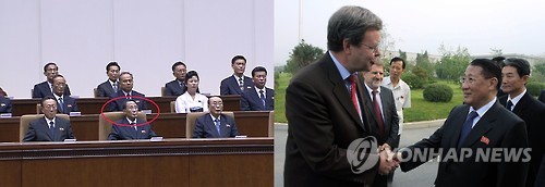 | △ 최근 급격히 야윈 북한 강석주 노동당 국제담당 비서 (서울=연합뉴스) 강석주 북한 노동당 국제담당 비서가 심하게 아파 몸무게가 20㎏이나 빠졌다는 증언이 나온 가운데, 지난해와 올해 강 비서의 대조적인 모습이 눈길을 끈다. 지난달 김정일 국방위원장의 당 사업 시작 51돌 중앙보고대회에 등장한 강석주 비서(왼쪽 빨간 원)는 지난해 9월 유럽순방에 나설 당시 사진(오른쪽)보다 상당히 야윈 모습이다. 최근 북한을 방문한 울프강 노박 전 유럽의회의원은 20일 정부서울청사에서 홍용표 통일부 장관을 면담한 자리에서 "우리는 (북한을 방문했을 때) 미스터 강(강석주)이 매우 아픈 것을 보고 놀랐다"며 "그의 몸무게가 20㎏나 준 것을 보고 충격을 받았다"고 말했다. 2015.7.20 nkphoto@yna.co.kr |