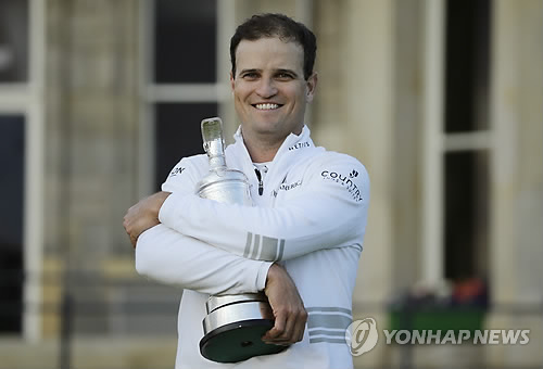 | △ 소중한 디오픈 트로피예요 (스코틀랜드 AP=연합뉴스) 잭 존슨(미국)이 20일(현지시간) 영국 스코틀랜드 세인트 앤드루스 골프장 올드코스에서 열린 제114회 브리티시오픈 골프대회에서 우승을 차지한 후 트로피를 품에 꼭 안은 채 포즈를 취하고 있다. |
