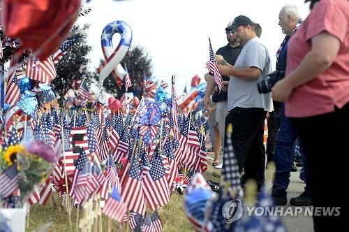 | △ 많은 미국 국민이 20일(현지시간) 테네시 주 채터누가의 미 해군 예비역 센터에서 닷새 전 총기 난사 참사로 희생된 미 해병 4명과 해군 1명 등 장병 5명을 추모하고 있다. (AP=연합뉴스) |