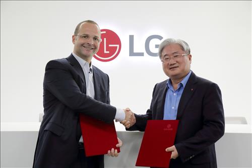 | △ 김대훈 LG CNS 사장(오른쪽)과 안드레아스 머스터드 미국 소네딕스 사장이 21일 태양광 발전소 사업 계약을 맺고 악수를 하고 있다. |