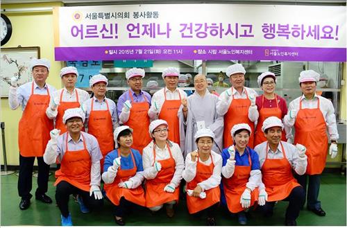 ▲ 박래학 서울시의회 의장은 21일 오전 의장단과 상임위원장 등 서울시의회 의원들과 함께 서울노인복지센터를 찾아 격려금을 전달하고 배식 봉사활동을 했다. 이날 복지센터 방문은 제9대 서울시의회 개원 1주년을 맞아 이뤄진 것이다. (서울=연합뉴스)